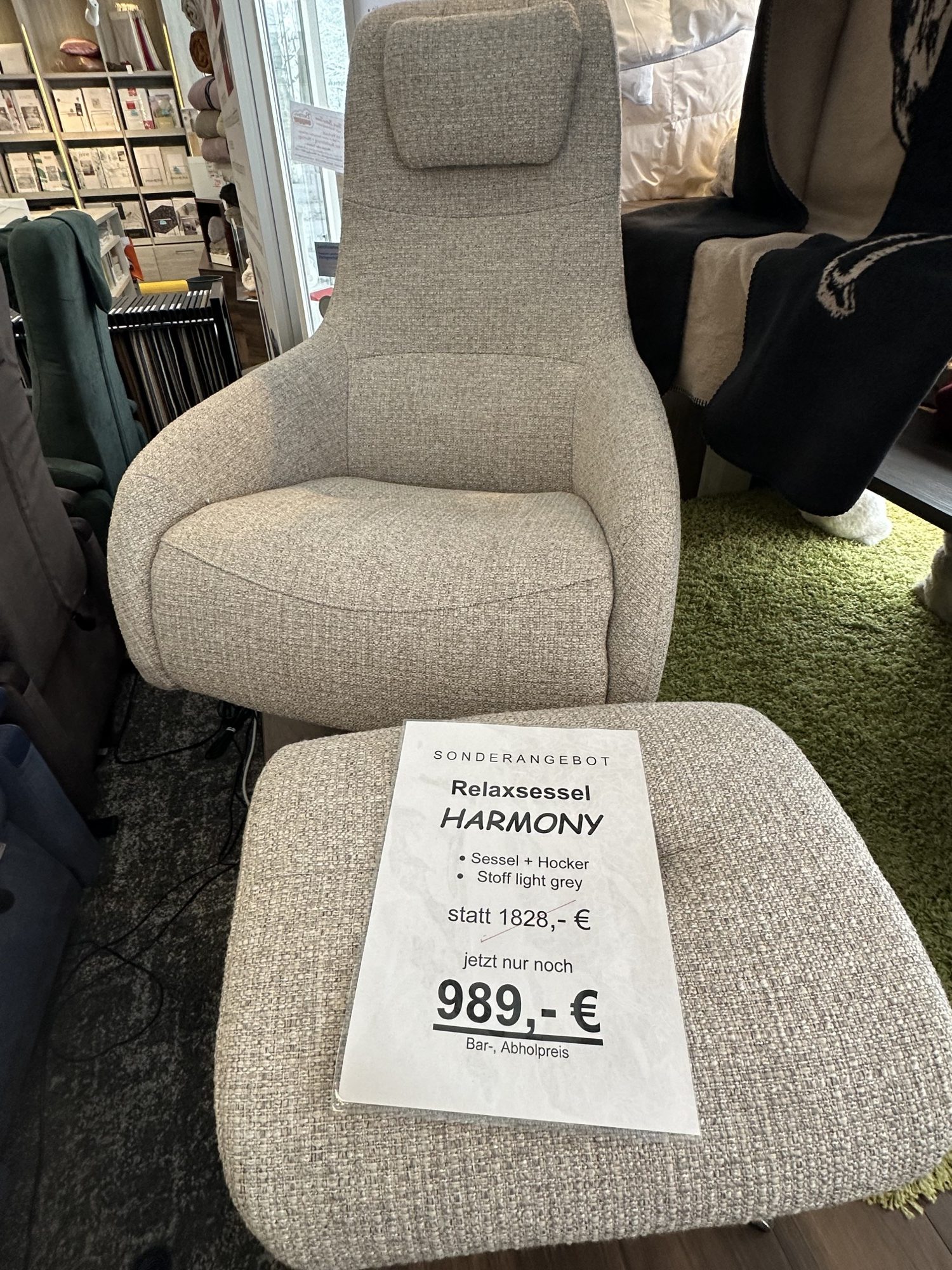 Sessel und Hocker Harmony in Stoff hell statt 1828,- € nur noch 989,- € bei Selbstabholung